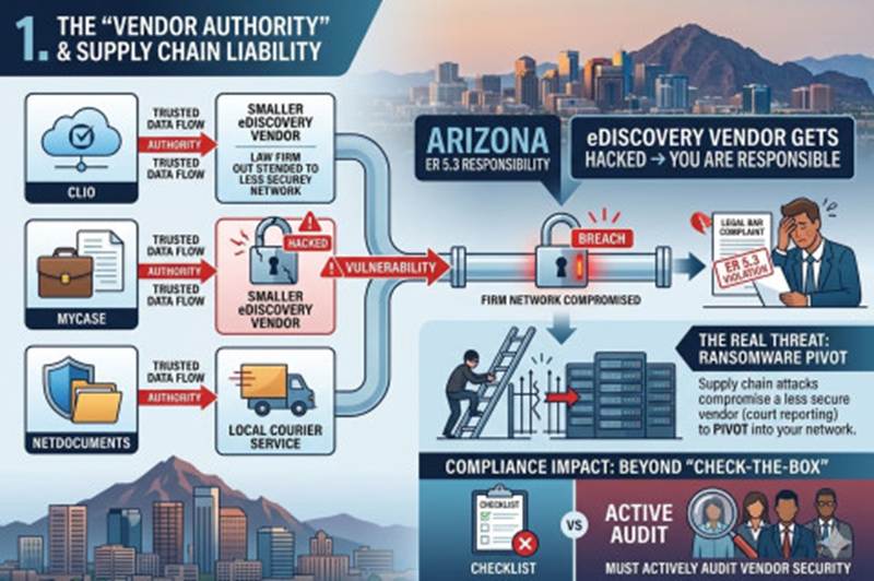 - The Challenge: Under ER 5.3 (Responsibilities Regarding Nonlawyer Assistance), Arizona lawyers are ethically responsible for the conduct of their vendors. You cannot simply “outsource” liability. If your eDiscovery vendor is hacked, you are considered to have failed to safeguard client confidence.