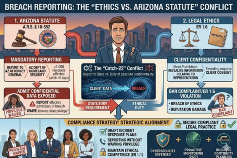 Arizona lawyers face a unique “Catch-22” when a breach occurs, balancing client confidentiality against state reporting laws.